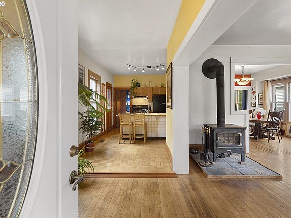 This charming home features wood floors throughout, a cozy living room warmed by a wood stove, and kitchen with island, walk-in pantry and access to the backyard. Upstairs are 3 bedrooms. The main floor offers 2 bonus rooms, add a closet and you have a fourth bedroom. The backyard fence is tree-lined for enjoying the hot tub in privacy.