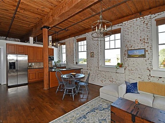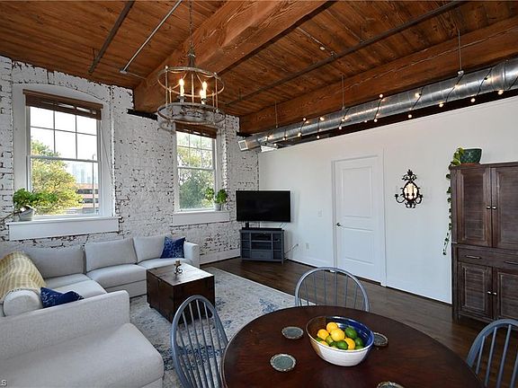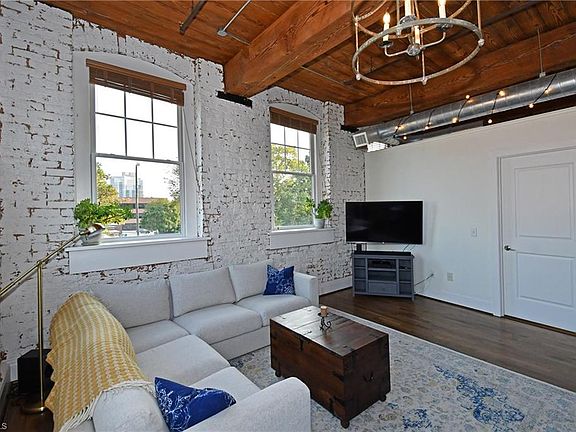 Absolutely gorgeous 2 BR/2 BA end unit condo w/ natural light from expansive windows. Enjoy white-washed exposed brick, high ceiling, ductwork, original wood beams-with upgraded industrial lighting, bath granite counters & wood flooring throughout! Live the dream of being in the heart of Winston-Salem downtown life-blocks from Trade St. Art District. A perfect mixture of old & new. Love the newly renovated exercise rm, dog park & patio w/ grill. HOA dues include water & sewer. Covered parking & storage.