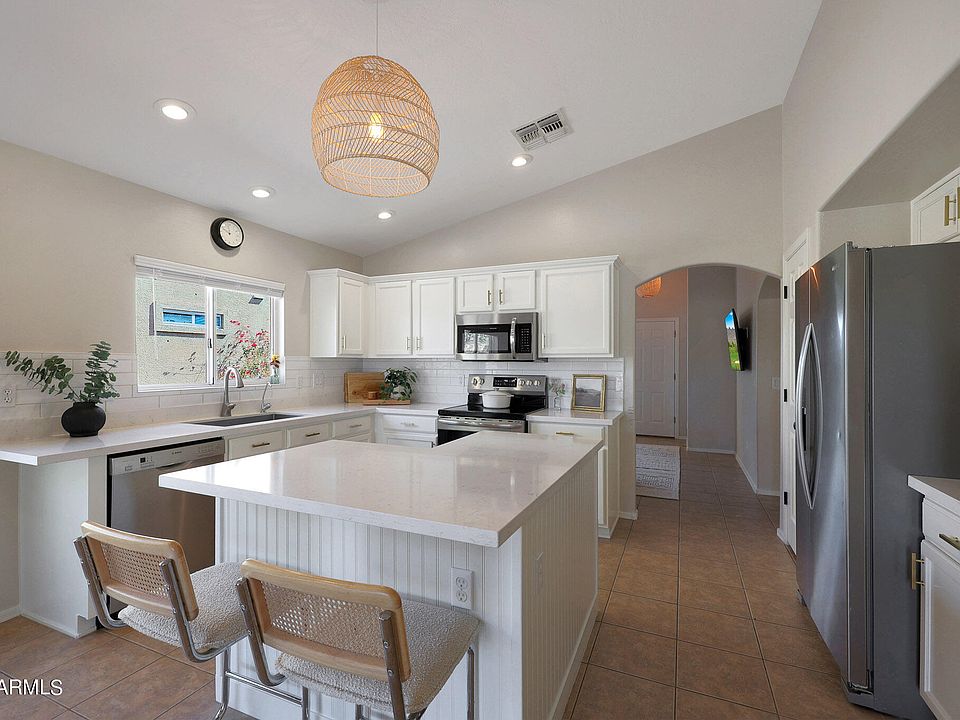 Step inside to discover a well thought out floor plan accentuated by vaulted ceilings and an abundance of natural light. The remodeled kitchen is a chef's paradise, featuring sleek stainless steel appliances, gorgeous upgraded cabinetry, and stylish tile subway backsplash. The kitchen island provides ample space for meal prep or casual dining, making it the heart of the home.