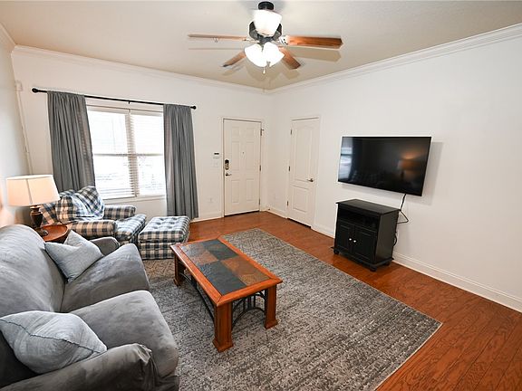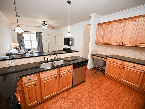 Tiger Transit stop + AU-some location just 0.2 mile from Auburn University campus! Well-maintained GROUND LEVEL unit with NO CARPET! Amenities include a sparkling pool w/ tanning deck & lounge chairs plus a gazebo grilling area. Unit faces the pool & gets great natural light throughout the day. Two spacious bedrooms, each w/ en suite bath & ample closet space. Open concept living area & kitchen, both w/ hardwood flooring. Fantastic kitchen! Granite countertops, tile backsplash, SS appliances, raised breakfast bar w/ seating for 4, & even a built-in desk! TONS of cabinetry, counterspace, & outlets. Additional storage includes coat closet, linen closet, & phenomenal laundry room/walk-in pantry. Crown moulding throughout. Security system. Full size washer & dryer. PET FRIENDLY COMPLEX! Swimming pool, grounds care & landscaping, exterior insurance, exterior maintenance, outdoor lighting, & termite bond.