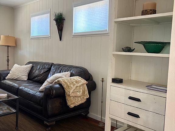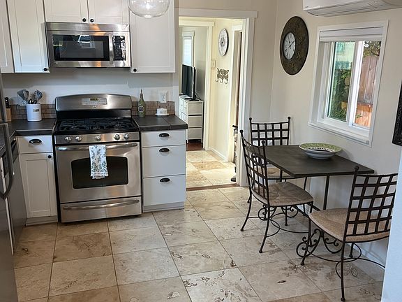 Furnished 1 bedroom/1 bath single family home. This private home is located in a quiet neighborhood just 1 block from the water. The kitchen is fully equipped and has a gas range, dishwasher, microwave and full-size refrigerator. The living room has a leather sofa, coffee table, end table, New 55 smart TV and entertainment center. The bedroom has a pillowtop queen bed, 43 TV and a sliding glass door leading to the peaceful, private backyard. Plus a stackable Bosch washer and dryer located in the bathroom. Water, garbage and sewer included. New efficient mini split heat and air. On demand water heater. Close to public transportation Month to month furnished rental