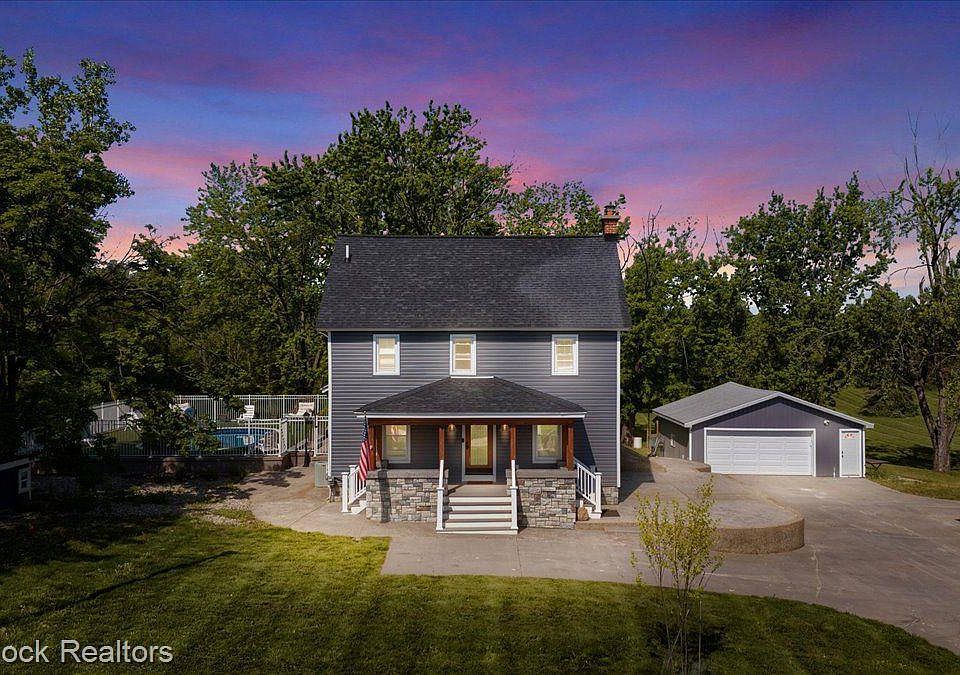 Completely remodeled from top to bottom, this stunning 3 bed/2 1/2 bath Modern Farmhouse offers an idyllic retreat on 4 picturesque acres. Boasting a heated in-ground pool with a concrete and turf surround, as well as an impressive, insulated pole barn—dubbed the WO/MAN Cave—equipped with heating, a movable bar, electricity, water, and a convenient half bath, this property is tailor-made for entertaining, especially on game days! Upon stepping onto the charming covered front porch, you're welcomed into a bright and open floorplan, featuring a spacious living room and a brand-new full bathroom complete with a shower, lockers, and a shiplap wall. Designer vinyl flooring spans throughout, leading into the dreamy kitchen adorned with quartz countertops, newer appliances, a stylish tile backsplash, and a generously sized dining room. The kitchen seamlessly flows into the family room, highlighted by a wood-burning fireplace capable of heating the entire house, a convenient half bath, and a laundry room, with easy access to the backyard. Upstairs, discover 3 bedrooms, an additional bonus room, a full bath, and the potential for expansion with an additional 660 sq. ft. of finish-able space in the walk-up attic. The home also boasts newer siding, windows, and roof, ensuring both aesthetic appeal and structural integrity for years to come.