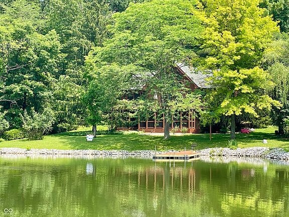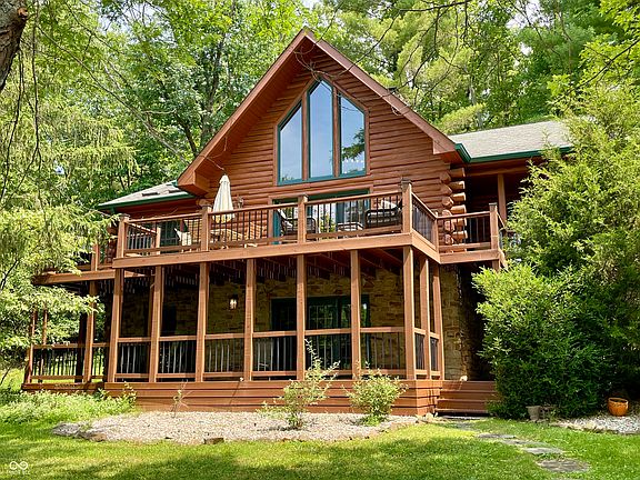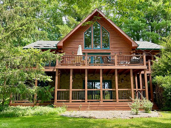 Beautiful Lamb Lake Lakefront log home. Over 100' of lakefront located on a gently sloping lot with NO STEPS to the water! Boat dock for easy lake access. Spectacular view of the "Big Idle" zone. Very nicely updated home with lots of cozy hardwood peg flooring on main level, wood burning fireplace in great room w/2-story ceiling, opens to lakeside deck. Updated kitchen with new appliances, quartz counters, gas cooktop and beautiful view of the pine trees to watch the birds and deer from the center island. Primary BR opens to cozy private covered deck overlooking the lake. Formal dining room and office could be re-purposed for guest accommodations. Walkout basement with full 2nd kitchen & bar, living room w/woodburning fireplace opens to lower deck and just a short distance to the water's edge! Handy bonus room with utility sink for whatever your needs may be. Come home to the best of lake living with water-skiing, boating, fishing, private beach with shelter house & internet, and so much more. Just 30 minutes to Greenwood and 45 minutes to Indy. High speed internet available for working from home.