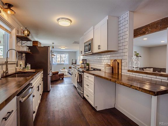 Open House Friday 4pm-6pm & Saturday 11am-1pm. Welcome home to this updated ranch-style home in popular Scenic Heights. This home has a classic layout with en-trend touches throughout. Gray walls, dark plank floors and crisp white trim says "turn key ready!" Previous homeowners have made strides in updating by adding fun lighting, ship lap walls, rolling barn door and more! Enter into the front room that leads to the dining room and open kitchen. Kitchen has updated white shaker cabinets, butcher block style counters, subway tile backsplash and open shelving. This leads on to the bright family room with a fireplace. Master and 2 additional bedrooms on this level as well as a full bath and ensuite 3/4 bath in the master. Baths have been updated. Basement is finished with a rec room, 2 non-conforming bedrooms and a 3/4 bath. Extra storage space and the laundry room round off this level. Attached 2 car garage. Lots of room to spread out! Backyard is large with mature landscaping. A dream for kids or pets. Location is perfect for shopping and restaurants. Just a few miles to Historic Olde Town Arvada, the Arvada Center for the Performing Arts and the new Light Rail Station. Also easy access to I-70 and Downtown Denver. Discover why this is the place you been waiting to call HOME!