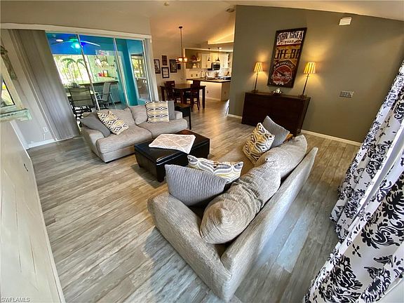About as modern and stylish as you can get and located in the heart of San Carlos! This spacious 3/2/2 floor plan boasts a new roof in Dec 2019, newer flooring, updated paint inside and out, updated fixtures and beautiful LED accent lighting in living room, kitchen & lanai area! The kitchen is gorgeously remodeled with modern cabinets, subway tile backsplash, concrete countertops, large pantry & stainless steel appliances. Guest beds both feature custom closet systems & the guest bathroom was renovated with butcher block countertop, vessel sink & direct access to the lanai. Master bedroom features 2 walk in closets as well as a walk in shower in the master bath. Includes Samsung washer & dryer that were purchased less than 4 years ago. The screened lanai has an amazing bar with concrete counter & overlooks the yard. Just beyond that you have an outdoor kitchen with 2 Primo grills & a mini fridge surrounded by a wraparound deck. Garage breaker panel has a generator outlet that will run power to well pump, 2nd bed, fridge & both baths! Hot water heater a year old, AC UV light system & water softener was rebuilt in 2019. BONUS! One 70" & two 32" tvs are included as well as the shed!