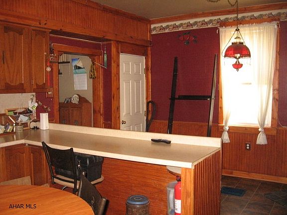 Spacious home with character! First floor has living room w/hardwood floor and shadowbox ceiling; large eat-in kitchen with wainscot, pellet stove, new vinyl tile, lots of cabinets; full bath w/laundry; family room at back w/full wall of wood built-in closets and drawers. This home has lots of storage areas!! 2nd floor has a front bedroom w/access to the finished room on 3rd floor; two more bedrooms; full bath. Hallway has wood ceiling, wainscot, linen closet & 2nd large closet. There's off street parking for 2-3; 14x6 front porch; side porch off the kitchen with access to the fenced-in yard; 24x12 carport; 24x24 garage w/one sliding garage door and workshop/storage on the left. Home was purchased 3 years ago through FHA loan. All new thermo-pane windows. Juniata Valley School District.