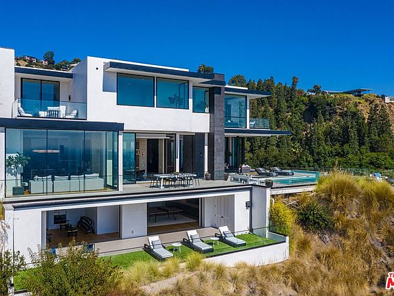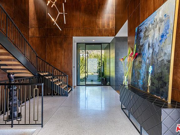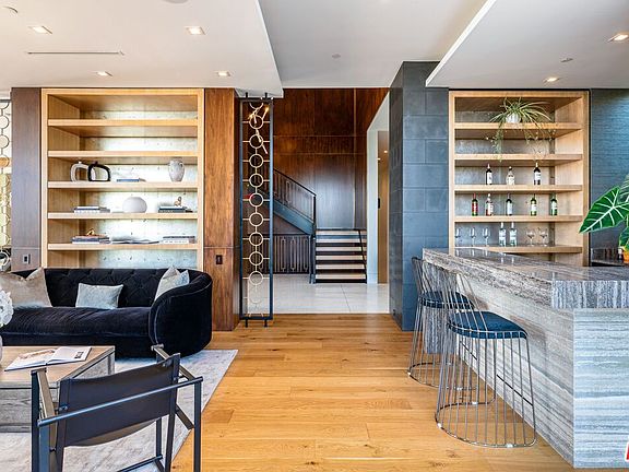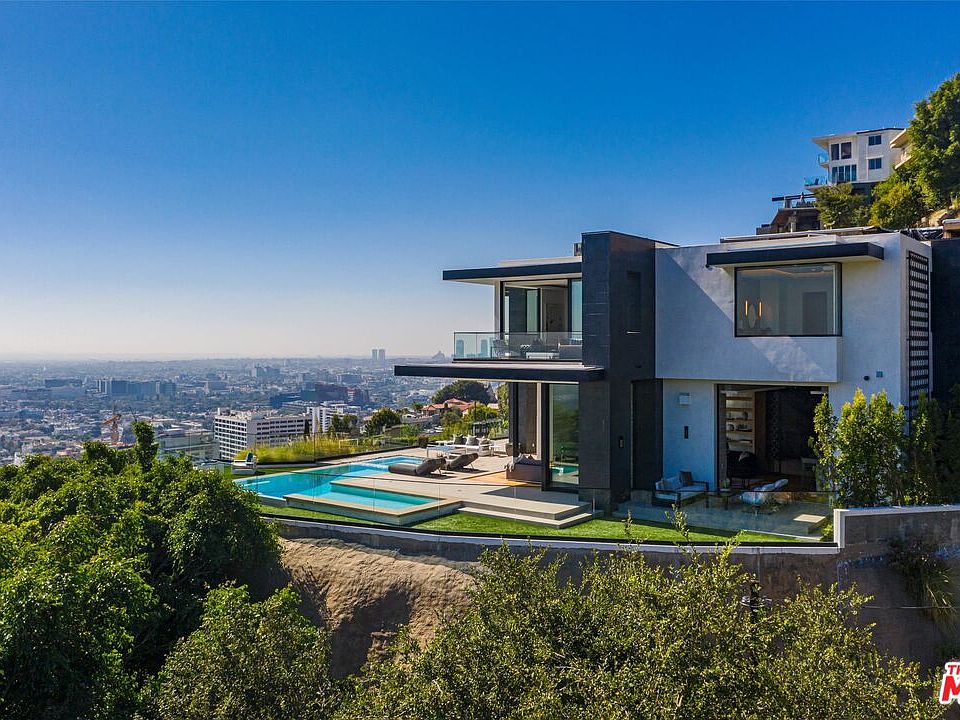 Quintessential Sunset Strip Modern with A+ views from downtown to the ocean! Walled and gated motor court, perfect for the high-profile privacy/security conscious. Double height entry. Versatile living rooms lead to vanishing walls of glass opening to wraparound outdoor space featuring an infinity-edge L pool, spa, firepit. Chefs eat-in kitchen with Gaggenau appliances, marble countertops, butler's pantries & double island. The primary suite features a sitting room, dual bathrooms, dual walk-in closets, and an outdoor patio. Movie theater, video wall in entertainment room with bar opens out to the view and terrace. Gym or guest suite w/ wet/dry sauna. Off street parking & 3 car garage. Award winning designer Tim Campbell used midcentury modern influences like grand terrazzo, antique brass, warm woods and elegant natural stone. Moments from Sunset yet perched on a promontory.