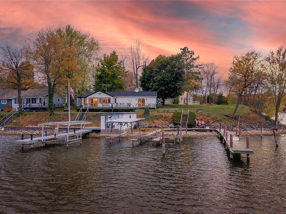 Breathtaking Views Await – Buy Now to Enjoy All Summer Long Next Year! Waterfront Gem for Sale at the Crest of Graves Point on Port Bay! Welcome to 8368 Graves Point Rd in Wolcott. This 3 Bedroom 2 Full Bath Ranch Home Offers 1,350 Sq. Ft. of Living Space. Open Concept Floor Plan with Front Sunroom, Family Room & Kitchen – Designed to Capture Panoramic Water Views from All! Recently Painted Interior. Master Suite Boasts Step-In Shower w/ Glass Door, Granite Vanity & Sliding Glass Door to Wrap-Around Deck Facing the Bay. Situated on 0.29 Acres w/ Approx. 185 Ft. of Bay Frontage. Enjoy East Facing Morning Sunrise over Port Bay & West Facing Sunsets Over Lake Ontario. Truly Stunning! Entertain on Your Choice of Multiple Deck Areas or Side Yard. Two Permanent Long Deep Water Docks (Accommodate 40’ Boat), Boathouse with Electric, 2 Boat Hoists, 2 Jet-Ski Hoists & New Break Wall 2020. Newly Tied-In Public Sewer & Municipal Water. Low Maintenance Vinyl Siding. Furnace & AC New in Last 8 Years. New Electric Panel. One Car Garage. Row Boat w/ Motor and Canoe Included with Sale. This Home is a MUST See!! Offers to be Presented Tuesday, 11/3 at 5pm.