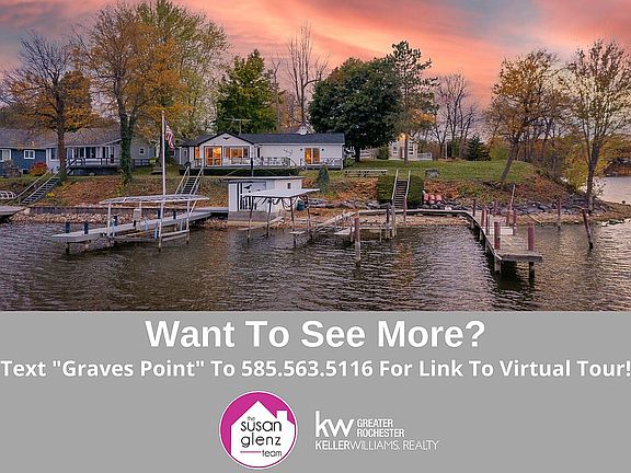 Breathtaking Views Await â Buy Now to Enjoy All Summer Long Next Year! Waterfront Gem for Sale at the Crest of Graves Point on Port Bay! Welcome to 8368 Graves Point Rd in Wolcott. This 3 Bedroom 2 Full Bath Ranch Home Offers 1,350 Sq. Ft. of Living Space. Open Concept Floor Plan with Front Sunroom, Family Room & Kitchen â Designed to Capture Panoramic Water Views from All! Recently Painted Interior. Master Suite Boasts Step-In Shower w/ Glass Door, Granite Vanity & Sliding Glass Door to Wrap-Around Deck Facing the Bay. Situated on 0.29 Acres w/ Approx. 185 Ft. of Bay Frontage. Enjoy East Facing Morning Sunrise over Port Bay & West Facing Sunsets Over Lake Ontario. Truly Stunning! Entertain on Your Choice of Multiple Deck Areas or Side Yard. Two Permanent Long Deep Water Docks (Accommodate 40â Boat), Boathouse with Electric, 2 Boat Hoists, 2 Jet-Ski Hoists & New Break Wall 2020. Newly Tied-In Public Sewer & Municipal Water. Low Maintenance Vinyl Siding. Furnace & AC New in Last 8 Years. New Electric Panel. One Car Garage. Row Boat w/ Motor and Canoe Included with Sale. This Home is a MUST See!! Offers to be Presented Tuesday, 11/3 at 5pm.