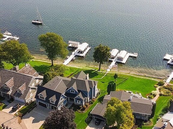 Stunning panoramic views come with this level lake frontage luxury home built in 2018. Sweeping lake views on all 3 levels from almost every room. Close to 7000 sq. ft of living space. Beautiful kitchen with 6ft Subzero frig and Viking 60'' double oven and hidden walk-in pantry. Main floor laundry and main floor in-suite master with steam shower and huge closet with island, 2 other in-suite bedrooms and one jack & jill. Exquisite landscaping with fenced yard and irrigation system. Lower-level family room with entertaining bar and walkouts to lower-level patio with screened porch. Lots of storage area too. 2 canopied piers. 102 ft. of frontage, 3- car garage and huge paved driveway. Turnkey, just bring your clothes. Jump on the lake path and you are one mile to downtown Lake Geneva!