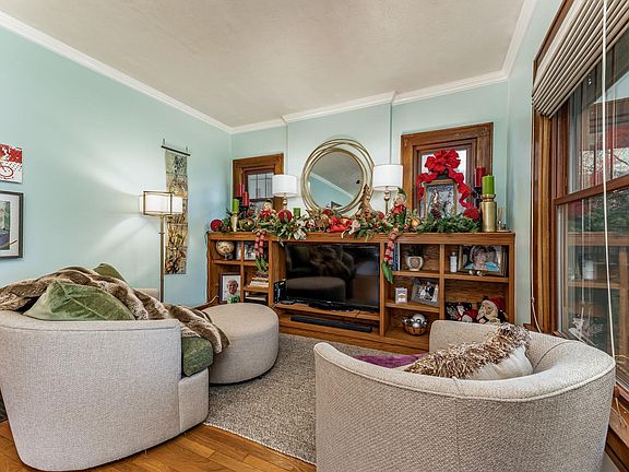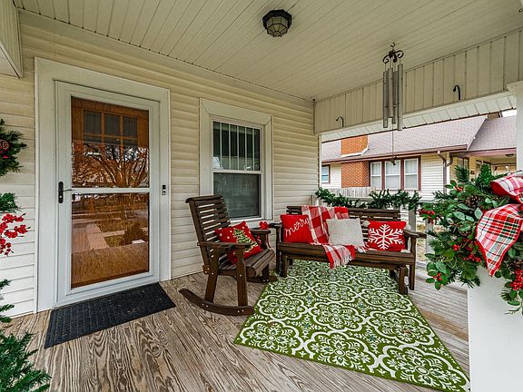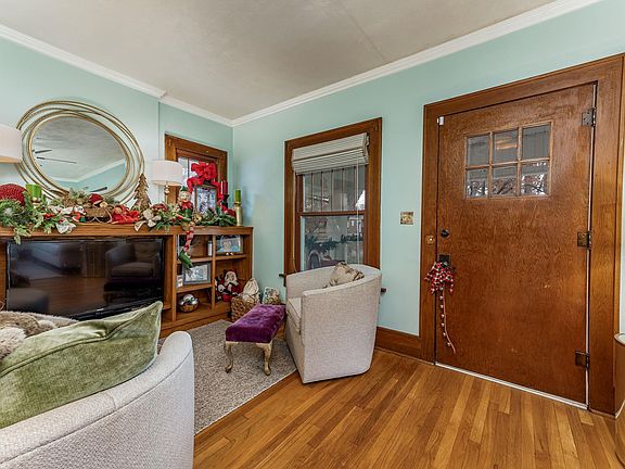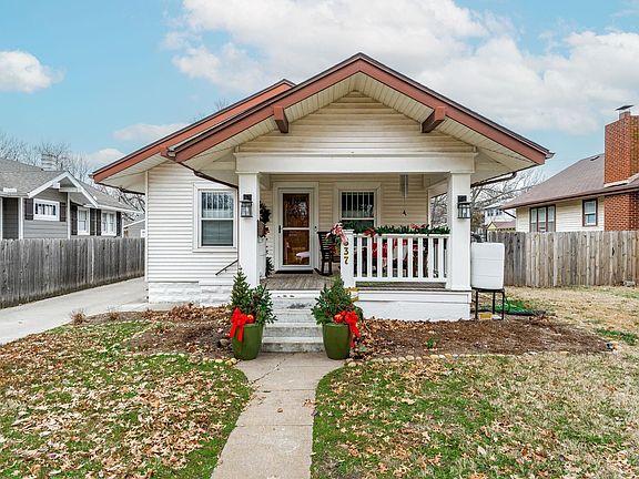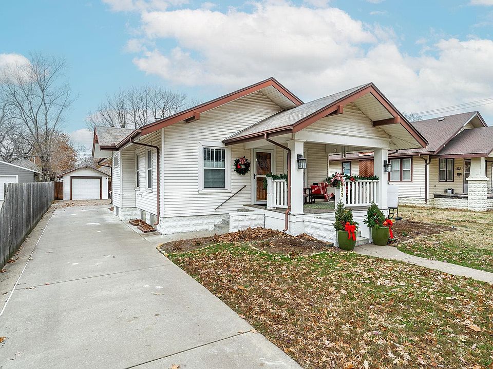 Welcome to this charming 2 bedroom, 1.5 bathroom bungalow nestled in the Riverside community. As you walk in from the covered front porch, the cozy living room offers the perfect spot for your gatherings. This inviting home boasts original hardwood floors and updated bathrooms for modern comfort. You will love the kitchen with ample cabinet/counter space, gas stove, farmhouse sink, built-in microwave and a walk-in pantry. There is a large formal dining room with beautiful glass french doors. The main bathroom features a tiled walk-in shower, updated vanity, tile floors and linen storage. At the back of the home, you'll find a nice drop zone area as you come in from the back door. There is a main floor laundry with cabinet storage and half bathroom. Although not technically finished, the basement has great additional living space and storage. Outside, you'll find a fenced yard, patio and oversized garage. Don't miss your chance to call this one home!