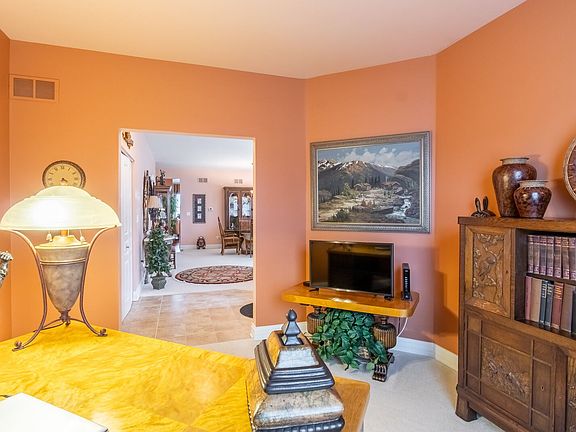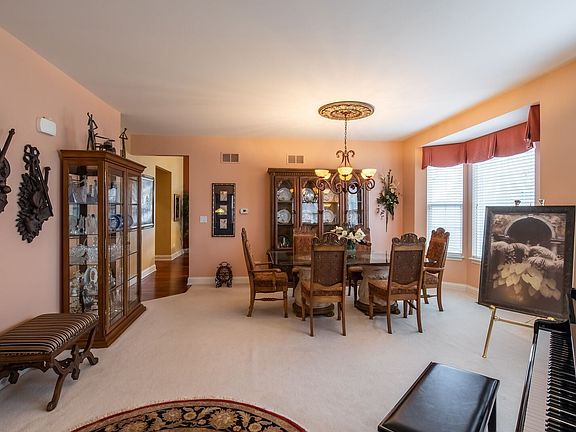 Better than new! Immaculate and elegantly appointed Palm Springs model with 2 bedrooms, den, formal living and dining rooms. Open kitchen offers custom island, 42" cabinets, breakfast bar, granite countertops, window over the sink and all deluxe stainless steel appliances. Kitchen opens to family room and sunroom all with vaulted ceilings. Gas fireplace in family room. Huge expanded master suite with vaulted ceiling, walk in closet and luxury bathroom with double sinks, soaker tub and separate shower. Large guest bedroom suite with bathroom. Hardwood flooring. Laundry room has closet, cabinets and utility sink. Custom millwork. Full unfinished 9 foot deep pour basement with rough-in for additional bathroom. 2 car garage. Awesome golf course views. Great location by the Clubhouse. Enjoy entertaining outside on the custom paver brick patio - marble pad surrounded with perennials and power for water feature. This is the perfect place to call home!