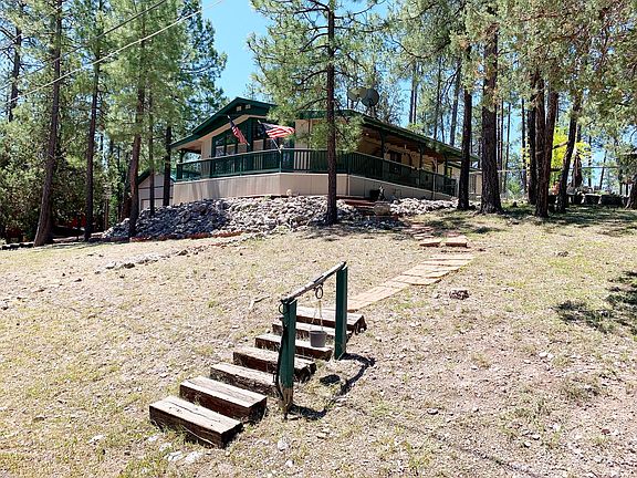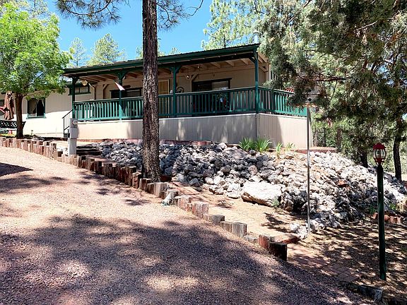 This beautiful, meticulousy maintained home, backs up to National Forest! You'll love the wrap-around deck and 2 patios for you to enjoy the great views! 2 updated full baths with new vanities and tile floor. Large open great room with lots of light. Ceiling fans and light kits throughout the home. Laminate flooring looks like real wood. Wooden blinds in living room and dining room . 2 car garage with fireplace and shed for your toys. Spacious kitchen with lots of cabinet space., newer appliances, and wine fridge. Block wall at rear of home backs Nat'l Forest. Partially fenced yard, RV gate and extra parking by garage. Lots of privacy on quiet street. Furniture for sale outside of escrow. This is a must see!