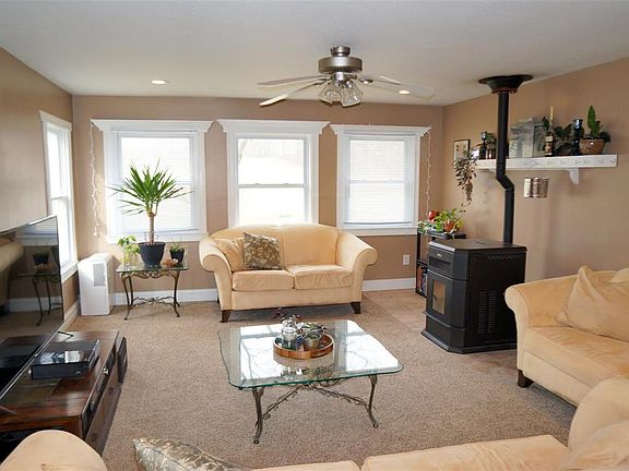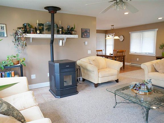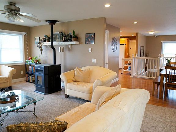 RIGHT TO THE POINT - This is a BEAUTIFUL HOME in an absolutely BEAUTIFUL SETTING! Vinyl sided raised ranch style home w/3 BRs, 2 full baths & 1,800 sq.ft. of living space on 2.43 rolling acres. Call for extensive list of recent updates - too many to mention! Lovely open flr plan on 1st flr; foyer w/coat closet, spacious dining area, living rm & kitchen. Nicely updated kitchen w/plenty of counter space & cabinets. Windows on 3 sides of living rm for great view of the countryside. 1st Flr full bath w/tub/shower combo & linen closet. Lower walk-out level; foyer, 3 BRs, recently finished full bath, laundry rm & utility rm/storage. Master BR features garden window & walk-in closet! Cozy heating; 1st Flr baseboard & pellet stove, lower level radiant heat in floors. Over-sized att'd 2-1/2 garage, workshop, dog door to concrete slab (used to be kennel), French doors back yard w/patio, fire pit & garden area. Red Barn too! Rolling countryside surrounds this home for the BEST sunsets!