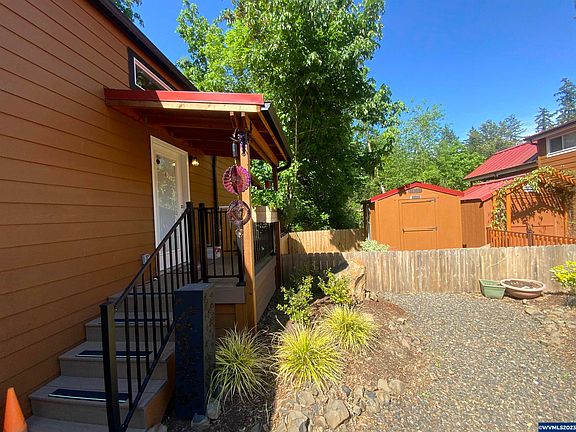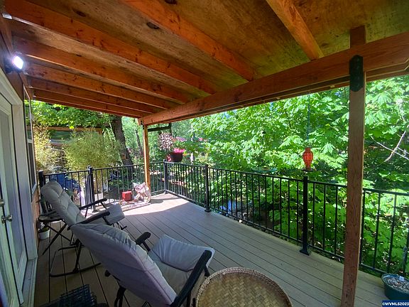 Large open floor plan, that is 15ft wide. The home has an added extension for the increased living room and dining room area. Custom cabinets with soft close drawers, large spice rack. Custom Quartz countertops in Kitchen and bathroom. Large Bedroom, with a 2nd bedroom potential in the loft. (low ceilings) Electric fireplace, Queen bed upstairs in loft also to be included. French doors lead you to a large covered deck overlooking the beautiful creek. Side yard fenced for pets. Two car parking w/carport