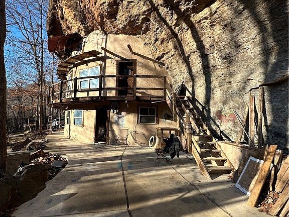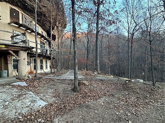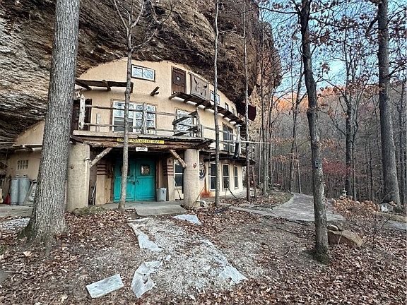 Two miles off of Scenic Highway 7 and short drive to the Buffalo River. Truly unique, hand-crafted bluff house and 81-acre secluded property provides a canopy of solitude with a unique and off-grid (electric is available) lifestyle. Unique mosaic floors compliment a one-of-a-kind staircase built out of a huge cedar tree. The house provides its own collection system that supplies water to the bathroom and kitchen. A wet weather creek runs to the side of the home with huge boulders and mature hard woods providing a beautiful landscape. Enjoy life in beautiful Jasper, AR with wildlife, waterfalls, trails, river...all things outdoors.