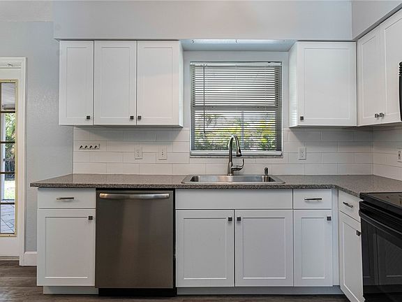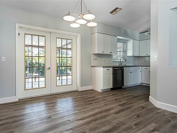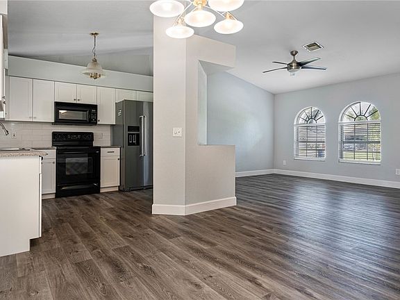 This 3 bedroom, 2 bath home is a solid home with several remodeled features. New kitchen cabinets, quartz counter tops, refrigerator and dishwasher all installed in 2022. New roof in 2021, new electrical panel, freshly painted inside and outside. New LVP flooring, vaulted ceilings, and 6" base in the main living areas. New carpet in the bedrooms. French doors from the main living area and master bedroom give access to the large screened-in lanai. New filtration system installed on the water system for the whole house 2023.