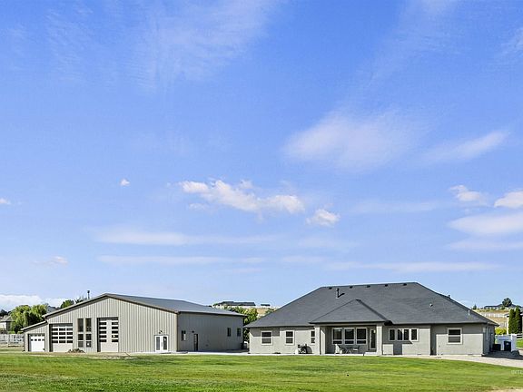 AMAZING HOME with an AMAZING SHOP, views! 3007 sq ft single level custom built home with a 4896 sq. ft SHOP on just over 10 acres! The house is 4 bedrooms with office, plus a large bonus/flex room & 3 full bathrooms. Large kitchen wi/custom cabinets, center island, granite counters, double ovens, a gas range & is open to the great room w/ a vaulted beamed ceiling and stone gas fireplace. Primary suite w/full walk in tile shower, soaker tub, & nice walk in closet. Upgrades throughout include wood floors, tray ceilings, custom finish work, & custom-built shelving & cabinetry. The amazing shop features tongue & groove walls, several windows, two 16' tall doors, two 14' tall doors, and two 8' doors. The shop has fully insulated walls, a wood fireplace, 6" inch concrete floors, a future loft area, 200 amp service, pre-plumbed for water and sewer. The possibilities are endless.