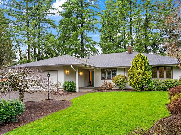 Classic, attractive mid-century one-level ranch in picturesque setting on cul-de-sac backing to Redtail Golf Course in Garden Home. Enjoy views year-round from multiple windows opening to the mature and beautifully landscaped back yard w/meandering patio. The front yard is equally as beautiful w/a generous, wide, inviting front porch w/covered entry. Inside features an open floor plan w/a large, tiled entry w/spacious coat closet; dining room w/floor-to-ceiling bank of windows; sunken living room w/large window and gas fireplace accented w/ sleek wood paneling and brick hearth. Two bedrooms feature hardwood floors, generous closets and casement windows. Primary suite w/double sinks, double closets and French doors to back patio/yard. Main bathroom w/retro accents and tiling. The kitchen w/breakfast bar, spacious pantry and eating area opens to the family room w/gas fireplace and door to back patio. A generous laundry room w/built-in cabinetry and desk is conveniently located off this space as well. New carpeting; freshly painted interior; newer gas furnace (2019) and AC (2021). Double-paned windows. Ample storage. Oversized 2-car garage w/storage area and closet w/shelving. Nice roomy garden shed. Ideally situated just a few blocks away from Garden Home Park and near Trader Joes, Starbucks, Garden Home Recreation Center, Fanno Creek Trail, The Old Market Pub, Washington Square, freeways, public transportation and more!! Welcome home!!