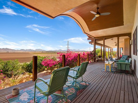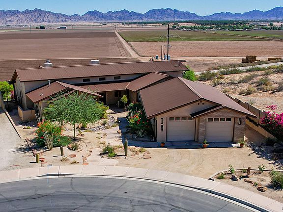 Welcome to this stunning luxury Arizona retreat, where modern design meets serene surroundings. The expansive open living, dining, and kitchen space offers a seamless flow, ideal for hosting gatherings or enjoying relaxed daily living, all enhanced by wood beams and soaring ceilings. With spacious bedrooms and beautifully designed bathrooms, a downstairs suite complete with its own kitchenette and lots of storage area. The primary bedroom is a true sanctuary, complete with a spacious walk-in closet, a luxurious bathroom featuring a huge tiled shower with dual shower heads, a freestanding soaking tub, and a private entrance unto the large deck to enjoy the amazing outside space. The gourmet kitchen is equally impressive, offering plenty of storage, high end Thermador appliances, 6-burner stove with griddle, warming drawer, walk in pantry, and a generous island complete with a prep sink. Step outside into a backyard that feels like your own private oasis. Wander along bougainvillea-covered flagstone pathways, relax in the hot tub or by built in grill or choose the cozy fireplace under the expansive covered patio. Enjoy multiple inviting seating areas, all while overlooking the amazing agricultural landscape and mountain views. With a 4-car garage, additional office space, and so much more, this home offers the perfect blend of luxury and tranquility. The view of Yuma doesn't get better than this!