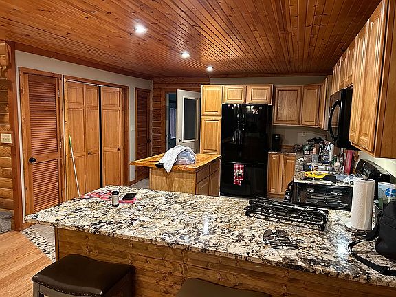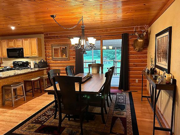 8' X 6' full yellow pine log home with entire front of home covered porch & rear yard deck. 3 Bedrooms,2 full baths, the office could be a 4th.bedroom.Tongue & Groove Pine cathgedial ceiling in the great room.Fireplace,mud room & garage -all of this on a 250'X 490'wooded private lot.Near to the lake & river,a convenient short distance to town and shopping areas.