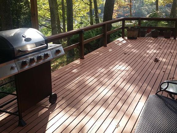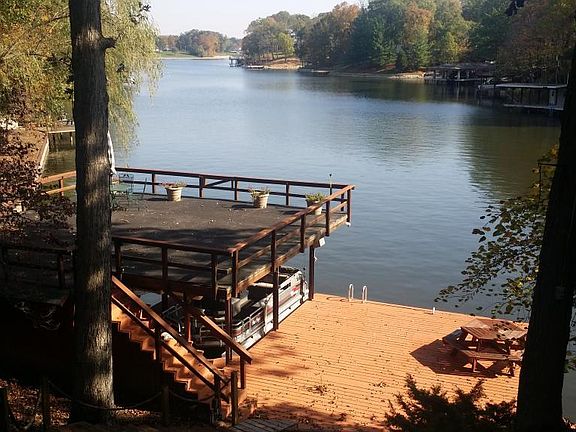 - FeaturesExterior: Large Trees, Deck, Landscaped, Shed, Outbuildings, Lake Access, Water Frontage, Ground Lvl Access, Lakeview, Dock, Wooded