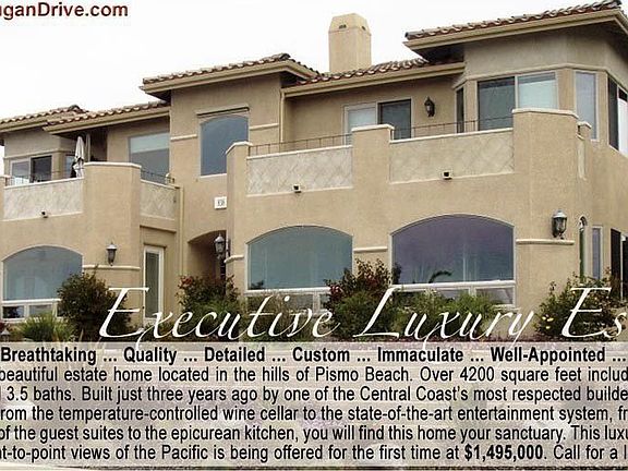 Price Reduced again! PANORAMIC Ocean VIEWS! This mediterranean custom home is pure luxury. This is a one of a kind home that has unique features-granite counter tops,crown molding,gas fireplaces,high-definition home theater systetm,2 master suites, S.S. appliances. Five spacious bedrooms, numerous view areas, wine cellar,large finished garage and so much more!Relax on your decks looking out to priceless white water ocean views from Avila to Point Sal.You can hear the calmness of the ocean!
