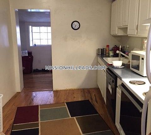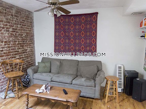 Galley kitchen with major appliances including dishwasher and white cabinets Bright living room with exposed brick wall Large bedrooms with exposed brick walls Bathroom with hardwood flooring Hardwood flooring Laundry in basement Near MBTA train/bus stop First, Last, Security, Broker s Fee
