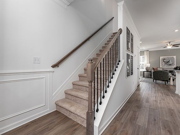 The Braselton II at Baker Creek Place by Smith Douglas Homes. Outdoor lovers prefer the Braselton II, by Smith Douglas Homes, for its unique rear corner covered porch, directly accessible from a large eat-in kitchen overlooking the family room. On the second floor, an over-sized loft separates the private owner's suite from two secondary bedrooms. Estimated completion date of 4/22/2024.