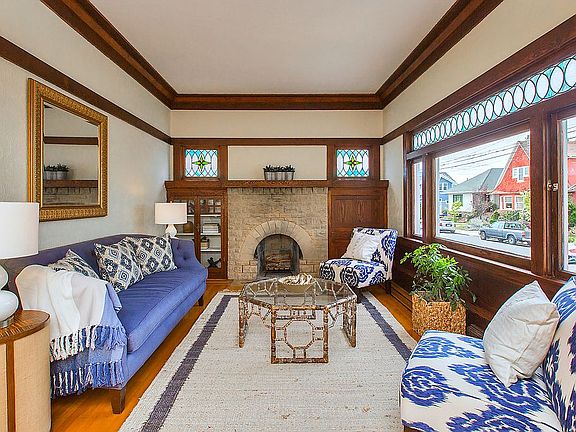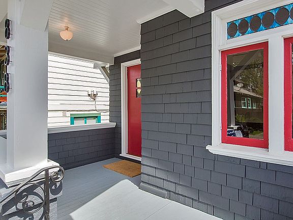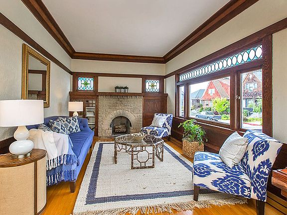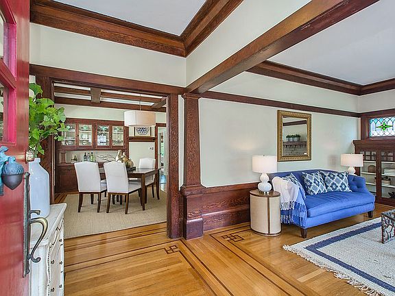 From the moment you walk through the front door of this beautiful Craftsman bungalow, it’s immediately apparent the attention to detail paid to this home by the builders. This classic home offers a formal foyer, living room, dining room, spacious kitchen, breakfast nook (or office), two bedrooms, one bathroom, a partial basement and garage. The warm and inviting living room is adorned with a pair of magnificent wood columns in addition to wainscoting, picture rails and an elegant crown moulding. The handsome brick and stone fireplace is topped with a wood mantel and framed by a built-in writing desk on one side, and a built-in glass-fronted display cabinet on the other. A pair of original stained glass windows above the mantel provides muted light and complements the geometric-patterned stained glass over the trio of windows facing the street. The stunning dining room has a wall of double-hung windows, a built-in with a sideboard and a leaded and stained glass china cabinet above. A wide plate rail graces two walls, and the dramatic boxed beam ceiling adds beauty and formality to the impressive room. The spacious, updated kitchen has Vetrazzo recycled glass counters, a white Viking gas range, and a vibrant harlequin vinyl tile floor. The sunny kitchen nook is perfect for casual meals or an office, and looks out onto the lovely backyard, with a deck perfect for outdoor entertaining, a lawn, and surrounding mature foliage for added privacy.