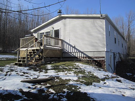Very private setting, 7.62 acres with woods! 3 bedrooms, 2 full baths, ranch style manufactured home. Freshley painted, new flooring throughout! Spacious full walk out basement with propane/wood forced air wood furnace installed 2011. New roof in 2015, deck for grilling. Shed for storage. Just in time for summer!