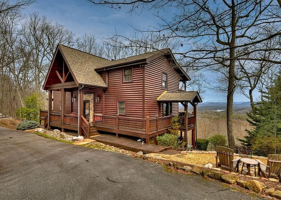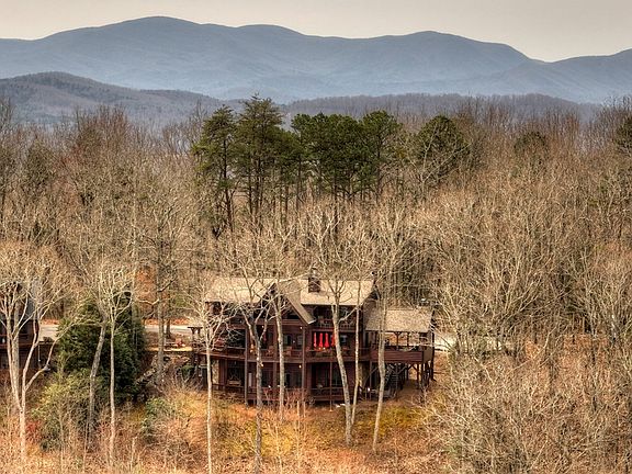 Built to showcase the lake and mountain view from every level, this stunning lodge is what the mountain life is all about. This log sided showstopper offers three levels of living complete with four bedrooms and four and a half bathrooms - there is an amazing amount of entertainment space with room for everyone, yet you'll still enjoy a cozy intimate feel when all your guests are gone. The abundance of glass throughout the home allows plenty of natural light indoors giving it a sense of warmth, and it also allows you to enjoy the view from your indoor living spaces. The main level offers a grand living room, dining area, and spacious kitchen along with the primary suite. Upstairs you'll enjoy two bedrooms & bathrooms, and on the terrace level you'll enjoy an additional living room, bedroom, bathroom & wet bar. Other highlights include three stone fireplaces - two indoors and one on the outside party porch overlooking the view, firepit area, stainless appliances, all paved access, and amazing convenience to both highly desired mountain towns of Blue Ridge and Blairsville, and, most importantly, to Lake Nottely! Whether you're considering full-time living or a mountain getaway, this beauty is sure to give you just the "head in the clouds" feeling you've been looking for, and it can even be purchased turn-key with most furnishings, decor and accessories available separately.