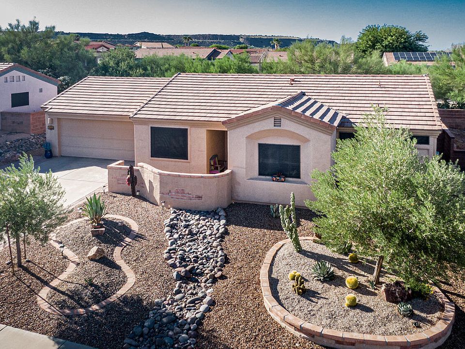 A Charming Las Campanas Home, a Front Courtyard with views of the Santa Rita Mountains, 2 Bedrooms, 2 Baths, Living /Dining, Nook and an Oversized Garage with plenty of Storage & a Laundry Tub, Tile Floors throughout, Updated Kitchen, Under Cabinet Lighting, Ceiling Fans, Whole Home Water System. A very Private Rear Yard that backs up to Natural Common Area, Covered Patio, extra Pavers, Fruit Trees and its own Water Feature. Very Well Maintained, Nice and Clean, Must See!!!