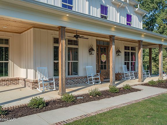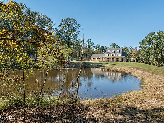 Introducing a stunning 2-year-old home nestled on over 6 acres in Olive Branch, MS, within the highly sought-after Lewisburg school system. This spacious 5-bedroom, 3 1/2-bathroom residence boasts a private setting, surrounded by lush trees and featuring a picturesque pond. The long driveway ensures utmost seclusion, enhancing the tranquility of this abode. Inside, you'll find an open plan loaded with the pinnacle of amenities. The kitchen features a pot filler, huge quartz island, 6 burner gas cooktop, double oven, dishwasher and refrigerator with custom cabinet panels and walk in pantry. Wood beams in ceilings. Exposed brick walls. Sliding barn doors. Sprinkler system. Beautiful tongue groove wood ceilings in all porches. A dedicated office space. Beautiful primary bath suite with ample closets and connected to a huge laundry room. Additionally, outdoor enthusiasts will appreciate the well-designed outdoor kitchen, perfect for entertaining and enjoying the natural beauty that surrounds this remarkable property including stocked pond.