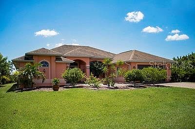 Beautiful custom pool home in desirable South Gulf Cove offers 3 bedrooms plus an office/den, and 3 full bathrooms. The large master suite has a tray ceiling with fan and subtle LED lighting, sliders to the pool area with sliding plantation shutters. As you head into the large master bathroom, there are two walk-in closets across from each other, a separate toilet closet, walk-in shower, jetted tub, two separate sink areas across from each other and built in medicine cabinets. The living room with its high ceilings, also with a tray ceiling and subtle LED lights, has sliders that lead out to the screened, caged, partially covered pool area with manual awnings for that extra shade. The large pool has a built in table and bench for relaxing in the privacy of the backyard. One of the full baths has a door leading out to the pool area for easy access. The separate dining room is a quaint space for intimate gatherings. The kitchen has dark gray stainless appliances that were added in 2017, dark granite counters offset by white cabinets, that include a glass front door, It has an eat in area perfect for family time. The laundry room off the kitchen has a deep sink and leads out to the garage. The two guest rooms are separated by a full bathroom with a shower/tub combination. The office/den is next to the 3rd full bathroom that leads out to the pool. Perfect set up for visiting relatives! South Gulf Cove is a short drive to the pristine sandy Gulf beaches, boating, fishing, golfing, shopping and dining. Come live where others come to vacation! This home is being sold as-is. The water heater was replaced in 2018. A pool leak was discovered and fixed August 2020. Receipt with warranty is available. There is a garage door opener that works, but needs to be re-installed. Being sold unfurnished. The majority of the yard decorations, statues, will be removed. However, the lions on either side of driveway will stay.