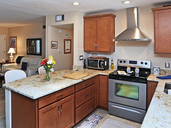 1st time buyer walked. Home better than ever with new re-coated roof and new AC compressor. Thoroughly renovated, beautiful kitchen wide open to living area .Kitchen features granite counters, large peninsula for food prep, dining, maple cabinetry soft close drawers/cupboards, 2 pantry cupboards, recessed lighting, all electrical kitchen, bath redone 2016, new electrical boxes, outlets redone 2016. Porcelain tile throughout. Upgraded glass door, water htr replaced 2020, new gutters 2017, newer back yard fence,. Back patio plumbed for hot tub. W/D convey. Guest parking across street from home. HOA monthly fee covers common area, pool and street maintenance, water, sewer. HOA only allows 16 rentals in complex. Quiet community close to everything you need. restaurants, schools and churches, golf and The Loop.