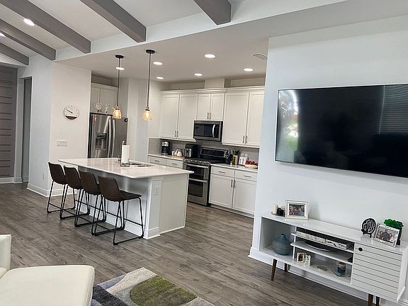 The kitchen overlooks the main living area and boasts beautiful countertops, and backsplash, 42'' cabinets with stainless handles, upgraded fixtures, under cabinet LED lighting, a large island with breakfast bar seating, and like new Whirlpool stainless steel appliance package with a double oven gas range. Effortlessly transitioning into the dining area, your attention is captivated by meticulous floor-to-ceiling details, including beamed ceiling accents, custom wall design, custom baseboards, and stunning laminate flooring.