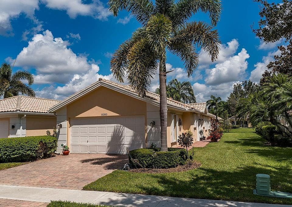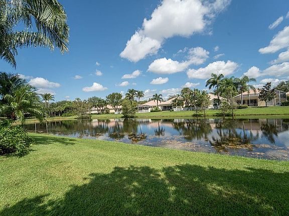 Extended Waterfront Capri Model. Builder is Davosta. Magnificent waterfront views from spacious great room & primary bedroom. Open kitchen with breakfast bar & nook. Formal dining room. Private guest suite. Utility room with cabinets, closet & sink. Property is on an easement, which makes the lot nice & larger. Engineered wood floors. No carpet. Newer AC. Kitchen appliances & the washer machine are all newer. One owner. Both bedrooms are ensuite. Primary bathroom has been remodeled. 2 pools in the community – 1 lap pool & 1 resort pool. Clubhouse also features a dog grooming, hair salon & restaurant. Excellent schools! Community is man gated. Seller paved the walkway, extended pavers & retractable awning on patio. Kitchen sink & countertops are granite. Sink is chocolate brown. Will not last!!