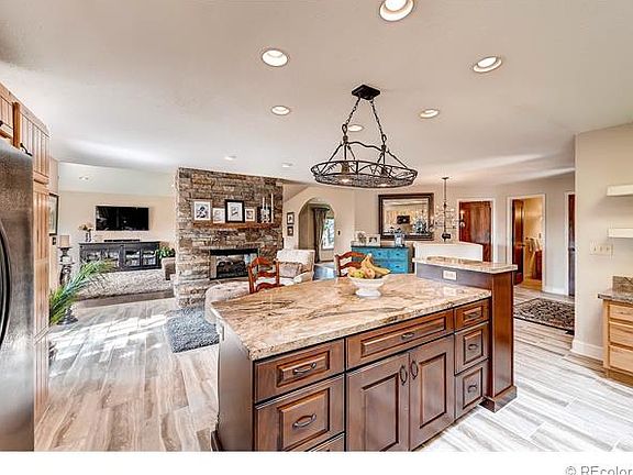 Stunning ranch with finished walk-out! Highly sought after location! Nestled in the trees with mountain views! Gorgeous updates throughout. Gourmet kitchen w/gas stove, pine cabinets, beautiful tiled backsplash, slab granite counters & huge slab granite island. Open concept floor plan. Large open great-room with sleek wet bar. Extensive designer wood floors &stunning tile-work! Double sided rock fireplace! Decorator touches throughout. Custom paint, molding, and doors. High-end window treatments and lighting. Huge elegant dining room addition with glorious floor to ceiling windows/views overlooking the trees. Lovely master suite w/smashing private bath including granite, custom cabinetry, jetted tub/steam shower. Built in vac. Awesome finished walkout basement with fantastic rec room, bar, handsome office w/bookshelves, huge bedroom w/private full bath &extra half-bath. Lovely landscaped lot w/ sod&sprinklers, gentle rolling hills, beautiful views, and trees galore! Total beauty!