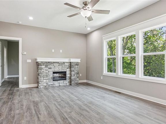 You'll love this BRAND NEW REVERSE ONE AND A HALF STORY! This beautiful home sits on a spacious treed walkout lot that backs to green space. The front porch welcomes you from the start. The main level has all you need with open living & kitchen, spacious master & laundry room. The kitchen features stainless appliances, quartz countertops & walk-in pantry. Master is complete with greenspace treed views, en-suite with dual vanities & walk-in shower. Walk-in closet has plenty of built in shelving. The walkout lower level is finished with a family room, 2 additional bedrooms both with large walk-in closets, a full bath & storage. This home will also feature an oversized patio 12 x 18 and a oversized driveway with circle drive. This new home won't last long! Home is complete and move in ready.