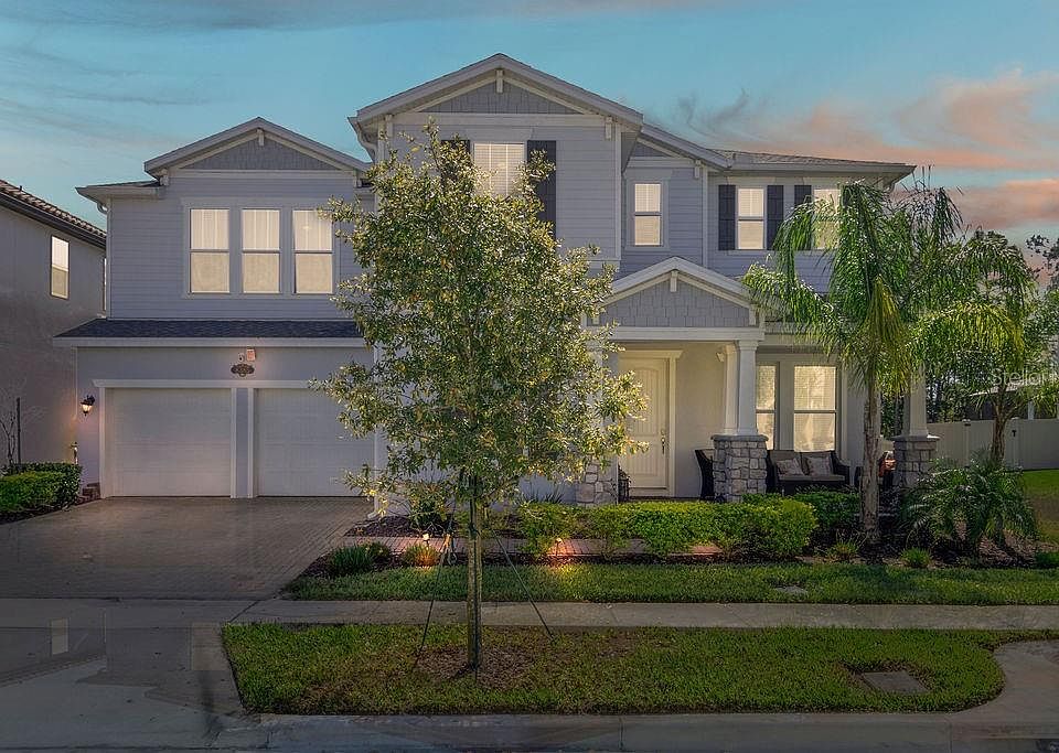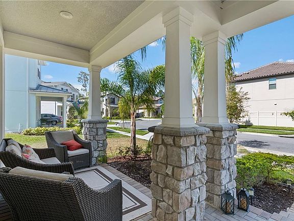 This exquisite home showcases impeccable interior design with luxurious custom finishes. The multipurpose outdoor living area makes this home the ultimate private retreat. This 5,000 sq. ft. residence is Energy Star Certified and comes complete with 5 bedrooms, 3 full and 2 half bathrooms. 2-car garage with custom workshop. The numerous upgrades include: 8ft doors, water resistant laminate flooring, coffered ceiling in dining room, tray ceilings throughout with exposed wood beams, marble countertops, and smart home technology. The master bedroom is downstairs. The second floor boasts a customized full home theater with reclining seats allowing a real theatre experience; 4 large bedrooms, a loft and a huge second family room/game room. The Gourmet kitchen includes an oversized kitchen island with waterfall edge, double wall convection oven/ microwave combo, gas cooktop with pot filler faucet, Butler pantry, 42" designer cabinets and a large walk in pantry. The outdoor living area has marble flooring, an extended covered lanai and panoramic screen offering spectacular views of the pond and conservation, including Disney fireworks. The oversized pool has glass tile, Spa, Salt system, multicolored lights and WiFi automation; includes solar panels AND gas heating, pool bathroom and a summer kitchen with high end grill. This beautiful home has high ceilings, includes a study, a valet/mudroom and an inviting front porch. ENERGY STAR features with R-38 insulation, 15 SEER HVAC and tankless gas water heater provide savings with low utility bills.