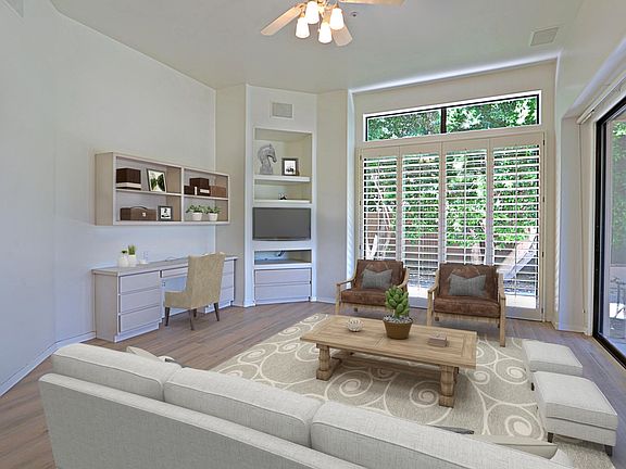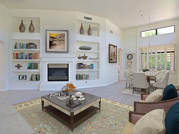 Scottsdale's gated community of Los Abrigados. This charming Southwestern style home has a very desirable single level split master floor plan. Formal living/dining rooms and kitchen open to the family room -- all on a large north/south culdesac lot. Master suite with sitting area, dual sinks, separate tub & shower, walk in closet and additional closet. Plantation shutters, gas fireplace in the living room. Extended covered patio, lush & grassy backyard with putting green. New interior paint and wood look tile and carpet completed in 2020. Community heated pool, spa, and grass park area. Fabulous McCormick Ranch area with quick access to shopping, restaurants, trails and the 101 freeway. Scottsdale unified school district.