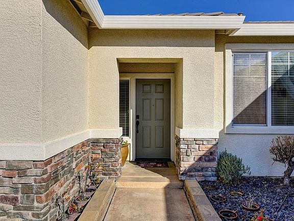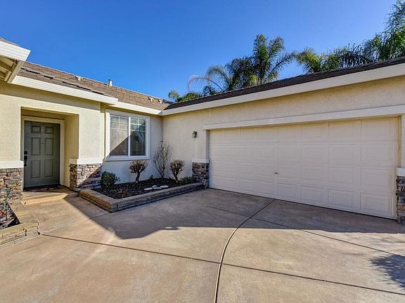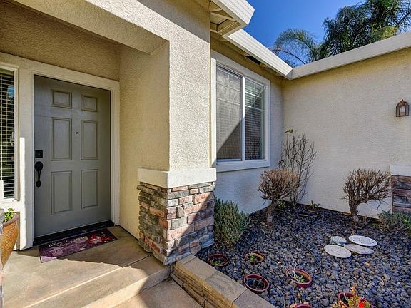Your Beautiful Arcadian Village Home located in North Elk Grove Awaits! Offering 1,840 living square feet, 3 bedrooms and 2 full baths. Nice tile entry way leading into the formal living/dining area. Then into the kitchen with Corian countertops and backsplash, gas cooking range plus under cabinet lighting, as well a pantry and lots of cabinet space. Breakfast nook area in the kitchen along with breakfast bar seating. Recessed lighting and ceiling fans throughout. Cozy gas fireplace and ceiling mounted speakers in the family room. The master bedroom offers a nice big double door entry, walk-in closet and master bath with tile stall shower and big soaking tub with double sinks and linen/towel cabinet space. Tile and carpet flooring throughout. Lovely landscaping in the front and back with covered back patio area, shed and garden boxes. Clean custom stamped concrete driveway extended to side gate area. Lots of recessed display and shelving space throughout the home and much much more.