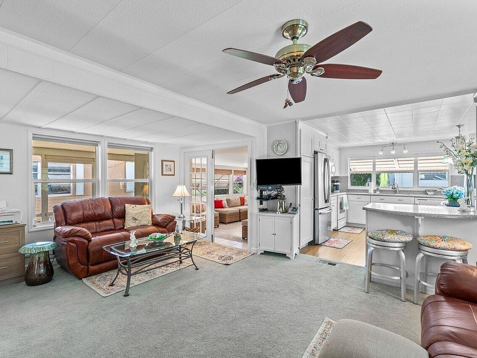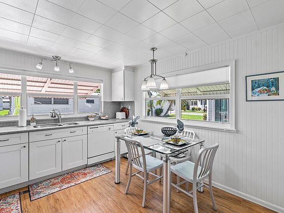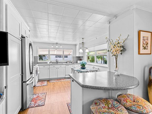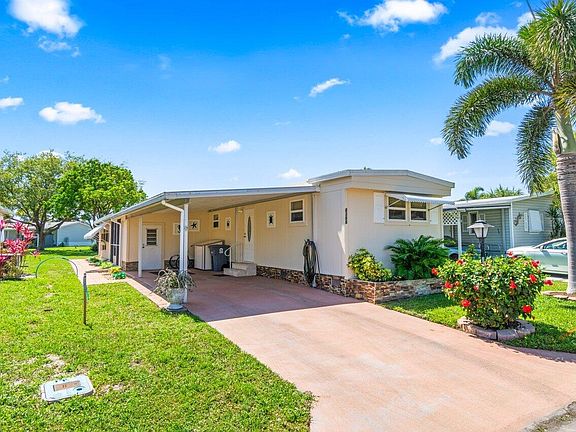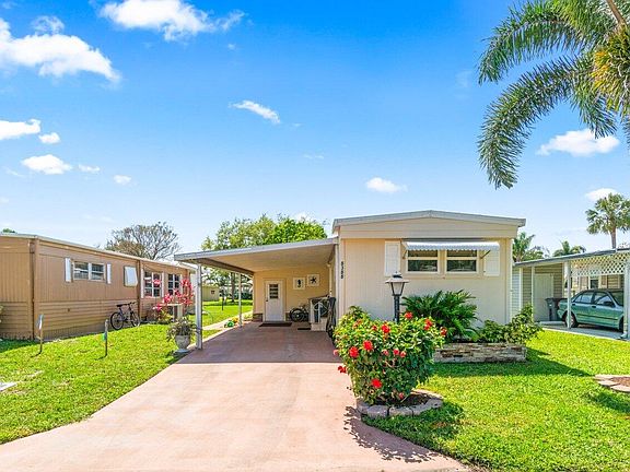 Renovated 2br/1bath single wide coach, amazing 55+ Coop, NO LAND LEASE, $215 LOW HOA. 2023 A/C, Storm Resistant Windows (not impact glass), Clam Shutters for + protection. 2 car Driveway, Shed. All windows have cellular shades. Durable & Maintenance free Cementboard on the outside. Screened and Tiled Porch. Full-size washer/dryer inside, spacious enclosed Florida room.Capital contribution $2,580.Clubhouse, Pool, Shuffleboard. Ideal Location close to FL Tpk, walking to Restaurants, GreenWise supermarket, Marshall, Home Goods, etc. This cozy coach has a surprisingly large, bright, opened kitchen, Martha Stewart Wood Cabinets, 2 Pantries, large working areas on Corian countertop. It is Fully Furnished, Turnkey. Enchanting little Backyard patio with decorative flower boxes, flowering bushes