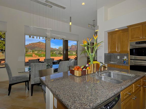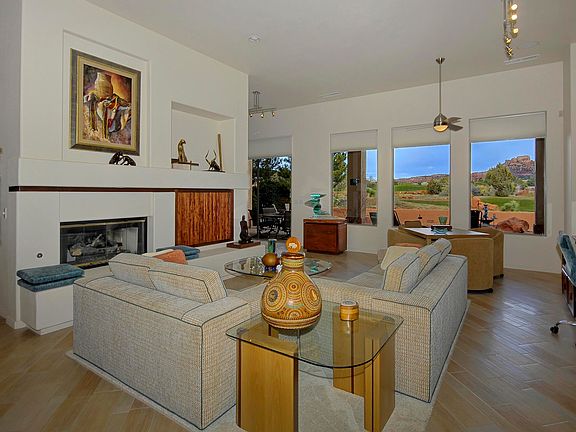 CAN U SAY WOW! 3 Bedroom home backing Golf Course dripping with Red Rock Views. Open Flowing Floor plan w/ Bleached Wood Plank Floor tiling & 12' ceilings. Custom Kitchen boasts granite, stainless steel appliances, double oven & wine cooler. Living room w granite buffet & fireplace. WALL of WINDOWS from Kitchen, Dining Area, Living Room that take in Northern facing VIEWS so no need to worry about the HOT sun. Additional Room w Closet could be office, bdr, or Man Cave. Master suite w/ Large Bath & Walk-in Closet w built-ins. Enough for anyone's shoes! This home spills out onto gorgeous outdoor space with flagstone patio equipped w/ Fire pit, outdoor gas barbeque & the perfect place to relax & enjoy the best of both worlds -Green Grass & Red Rock Views. Something hard to come by in Sedona