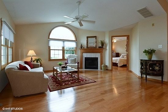 Gorgeous all brick RANCH town home! Gleaming Hardwood Floors and Warm Fresh Paint. Transom Windows fill the home with natural light. The Living Room features vaulted ceiling, gas start Fireplace with gas logs and opens to vaulted Dining Room with Skylight and updated chandelier. The open eat-in vaulted Kitchen also has recessed lights, uplights above cabinets, new hardware and fixture. Truly an inviting and open floor plan! The Master Suite has lighted ceiling fan, spacious walk-in closet and ensuite bath with double vanity and large step-in shower. A second bedroom is also on 1st floor with an adjacent full bath. AWESOME Finished 2nd Level with lighted ceiling fan and windows, ideal for Third Bedroom (huge walk-in closet), Bonus Room or Home Office! 1st Floor Laundry with washer/dryer. Two Car Garage with Storage Closet.