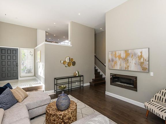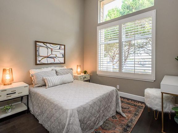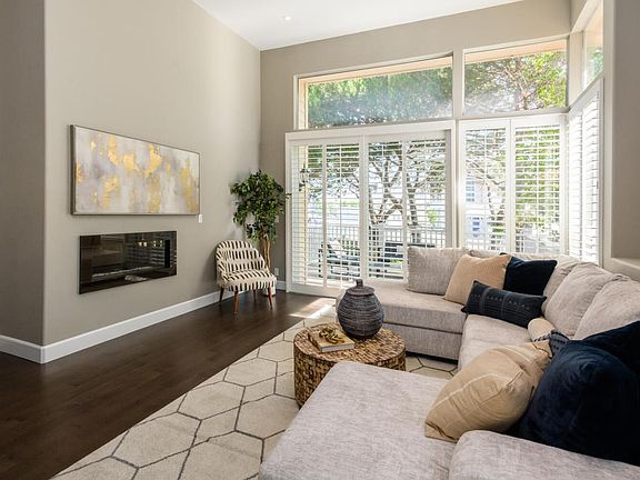 Designer appointed end unit townhome at Regatta in Redwood Shores. Three-level floor plan with vaulted ceilings, large format tile, and engineered wood floors throughout plus plantation shutters in every room. Amazing natural light from towering windows and transoms. Spacious living room opens to a large deck, plus a bed/bath on the same level, perfect for an optional home office. Fabulous renovated kitchen, dining area, and family room in one open space on the second floor overlooking the living room. Built-in wine bar, waterfall island with counter seating, and stainless appliances including gas range and extra refrigerator drawers. Two top-floor bedroom suites, including primary with fully customized walk-in closet. Two-car attached garage with laundry and plentiful accessible storage. Waterfront community pool and spa, path along the lagoon plus easy access to Bay Trail for miles of hiking and biking, water sports, great schools, library, and shopping center.