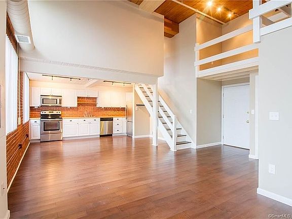 Move in ready, Warrenton Mill complex, immaculate New York style open concept. One bedroom plus loft, this townhouse features exposed brick and beams. Drive over the two lane wooden bridge that spans over the East Branch of the Naugatuck River. Enter the secure building. The flooring on the main floor is Allen Roth solid Maple hardwood. Lots of bright sunlight through expansive windows that are facing south east. Plenty of storage. All freshly painted and clean. The bathroom is white marble, and newly updated. Stainless steel newer appliances in the kitchen. Washer dryer hookups in the unit. Lots of charm and character in this unique & highly sought after, Warrenton Mill Complex. Shared laundry and fitness room in building, secured entry. Professional photos to follow. Management on site.