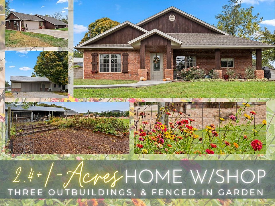 Charming Country Cottage on 2.4 Acres. Minutes from Branson West! Discover this beautifully maintained three-bedroom, three-bath home nestled on a serene 2.4+/- acres just min. from Walmart, Reeds Spring Schools, medical facilities, & only 10 minutes to Silver Dollar City. Step inside to find a spacious open layout that perfectly blends comfort & style. The living & dining areas flow seamlessly into a bright, inviting kitchen featuring a 4x6 island, abundant cabinetry, & beautifully painted cabinets & yes, all appliances stay. You'll love the home's cottage-style charm, w/LVP flooring, ceramic tile, cottage doors, & a ventless LP gas log fireplace framed by a classic brick surround. The primary suite offers his-&-hers closets, beautifully updated ensuite w/walk-in shower, two more spacious guest bedrooms, a gorgeous guest bath, & a cozy craft room w/extra storage for your creative projects. Additional upgrades include: PEX plumbing, an 18 SEER HVAC system (installed just 5 years ago), energy-efficient, all-electric appliances, private well w/new 87 gallon pressure tank, two-horsepower pump, plus durable board-&-batten & brick siding. Outside, enjoy peaceful country living surrounded by professional landscaping, colorful flower beds, & a raised, fenced garden area, perfect for anyone w/a green thumb. A 12'x40' covered shed provides flexible storage for gardening tools, lake gear, or even a dog kennel or chicken coop. For hobbyists & tinkerers, the 30'x40' shop building & 14'x20' outbuilding offer endless potential, while the attached oversized garage boasts vaulted ceilings & an 18-foot door, ideal for large vehicles, boats, or workshop space. W/ample parking, room to expand, & everything on one level, this property is as practical as it is picturesque. Sellers fave:Relax on the covered six-foot concrete front porch while watching the sunset. You'll never want to go on vacation again. This is more than a home, it's a retreat. Country tranquility w/city convenience!