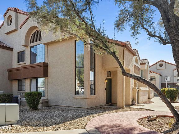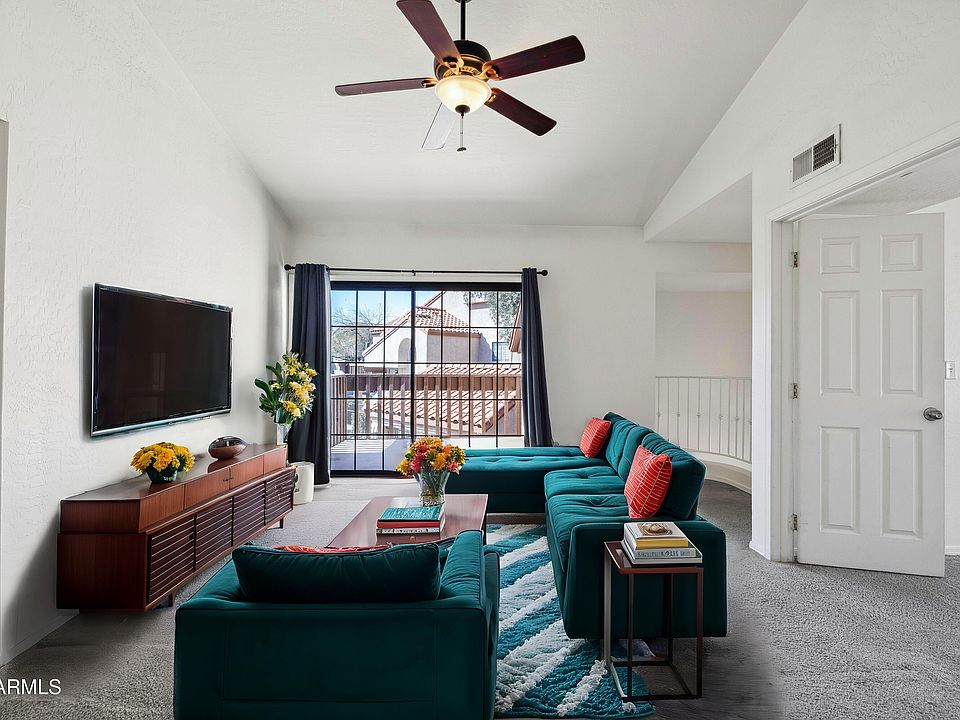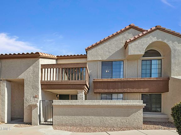 Ready to enjoy the perks of home ownership? You won't want to miss this 2 bedroom GEM tucked in the beautiful community of Fiesta Park Village! Come bring your style, & make this place your own! An elegant, winding staircase greets you at the front door, leading you to the spacious main floor upstairs. Vaulted ceilings follow you into the living room, which provides plenty of room for entertaining guests. OR step outside & soak in the serenity of your private balcony, overlooking the community pool (which is generally very quiet and not too busy). From the large glass balcony doors & plenty of windows throughout the house, you will love all the natural light that fills each room! Whether you are a ''home-body'', an investor, or seasonal snow-bird, this home is everything you're looking for